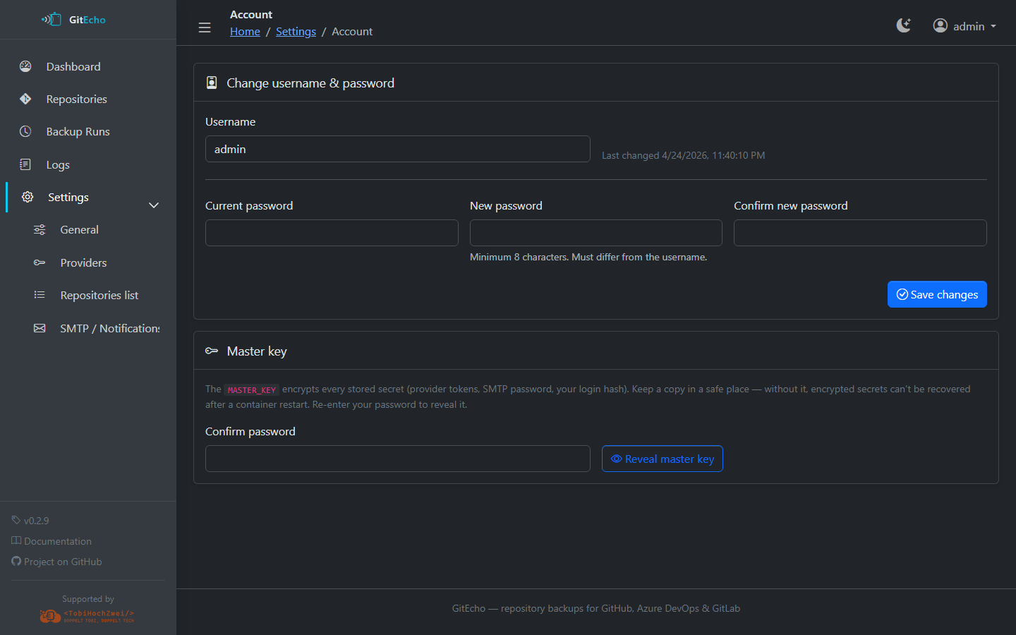 The Settings UI at /settings is the recommended way to configure GitEcho after the initial container setup. Changes are persisted to the /config volume and take effect without restarting (except cron schedule changes, which require a worker restart).