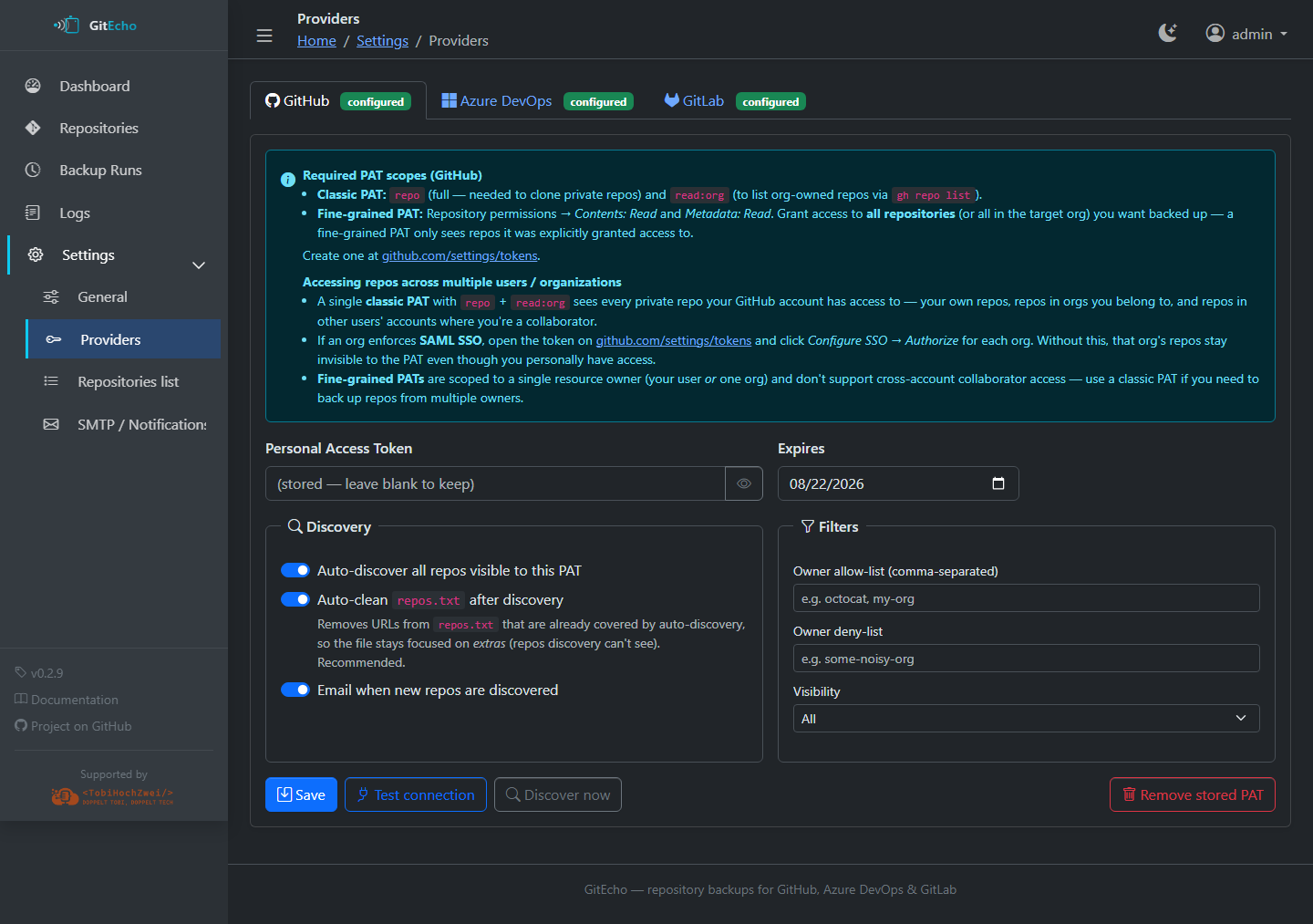 gh auth status,az devops project list, or GitLab API) - PAT expiration date — GitEcho warns before expiry via email