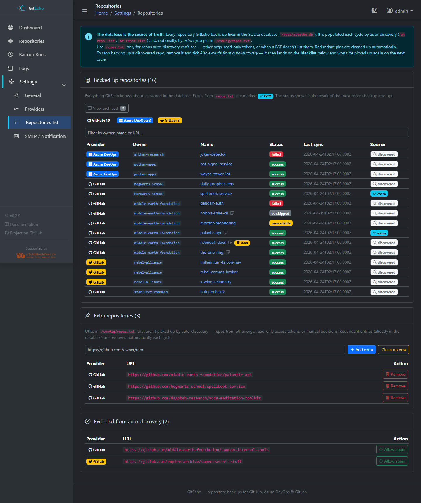 discovered(found via auto-discovery) orextra(pinned inrepos.txt) - Add/remove repository URLs