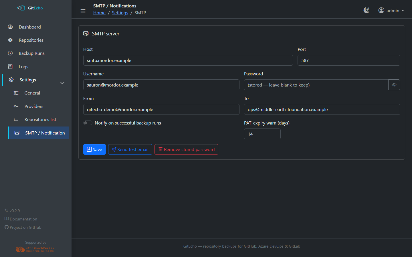 - SMTP credentials — host, port, username, password, from address, to address