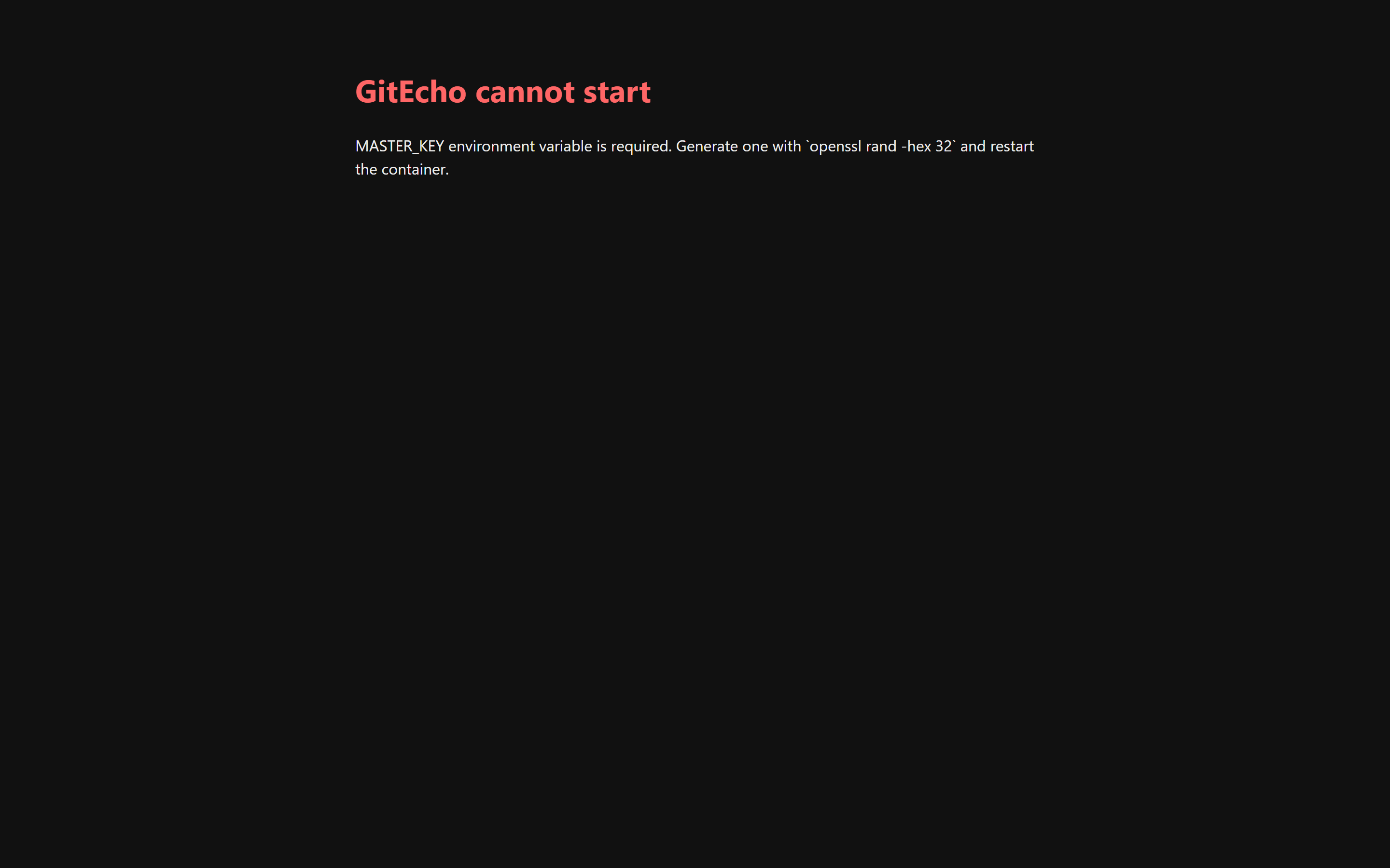 If MASTER_KEY is missing on boot, GitEcho refuses to serve any page and renders a 503 explaining what to do: