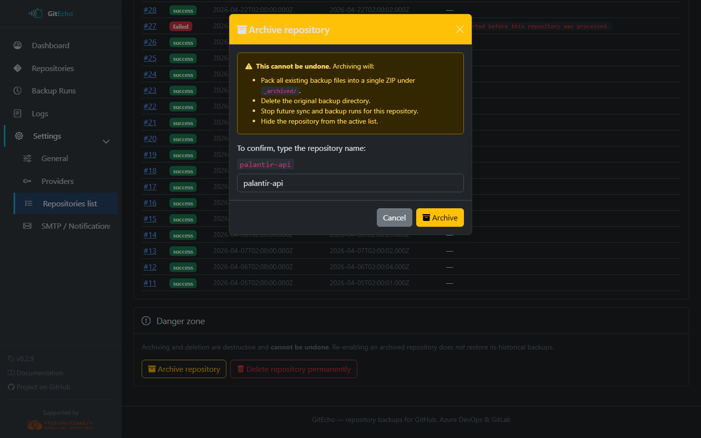 Moves any existing backup to /backups/_archived/<provider>/<owner>/<repo>/<timestamp>/