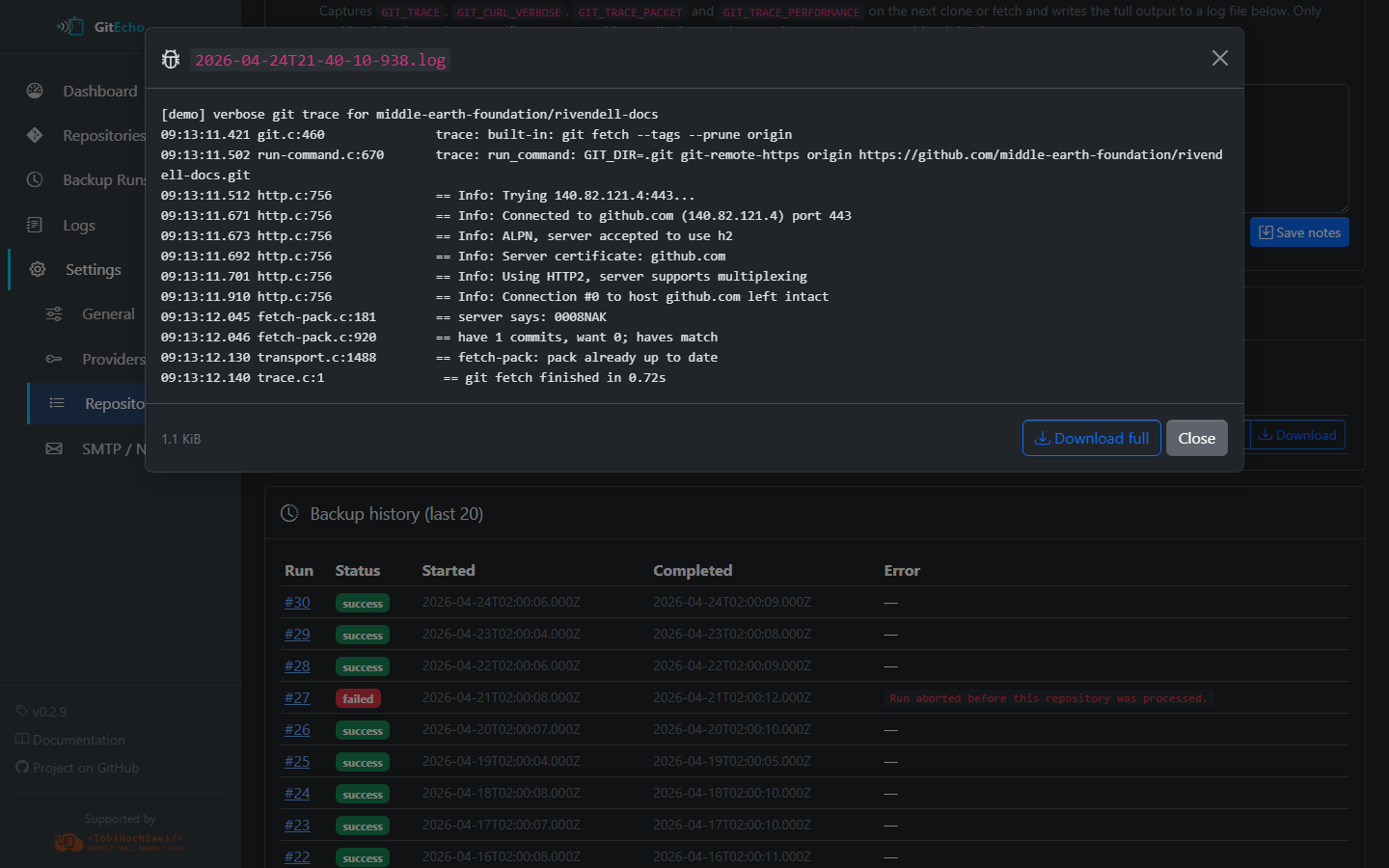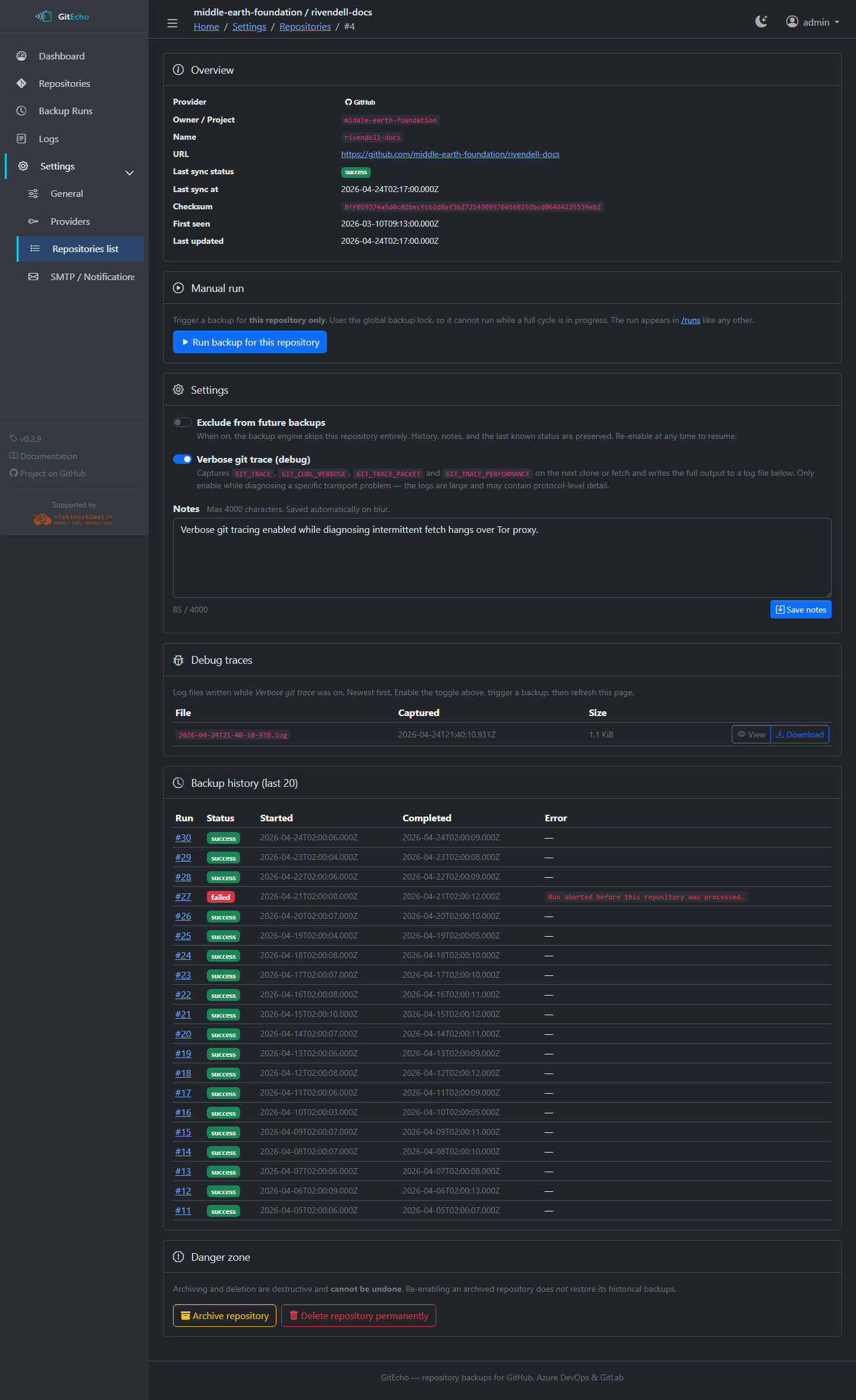 /settings/repos/<id>and enable Verbose git trace (debug) -