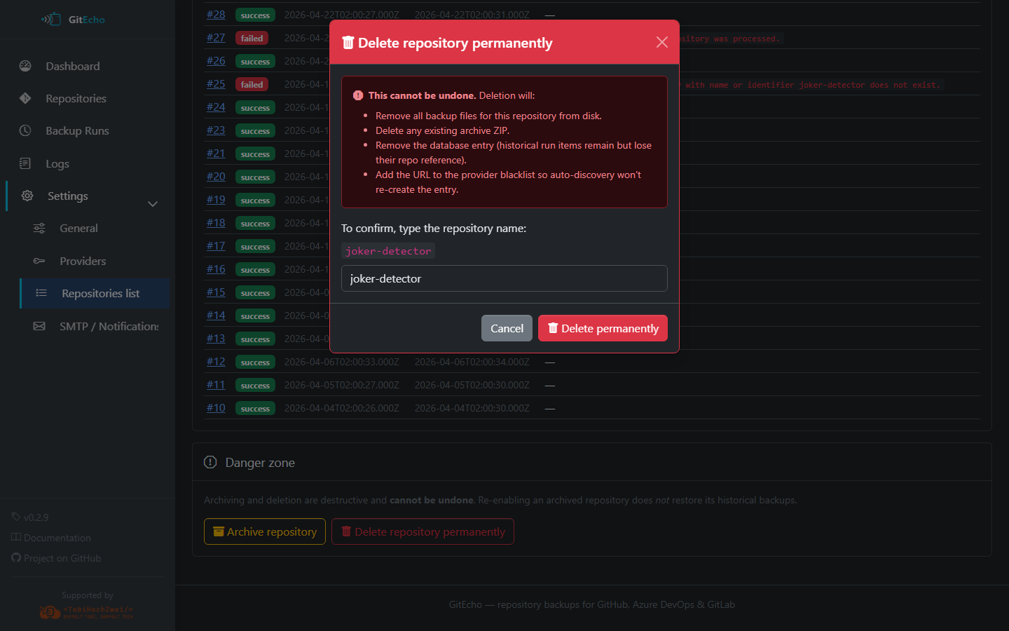 From Settings → Repositories → \<id>, the Danger Zone offers two terminal actions: