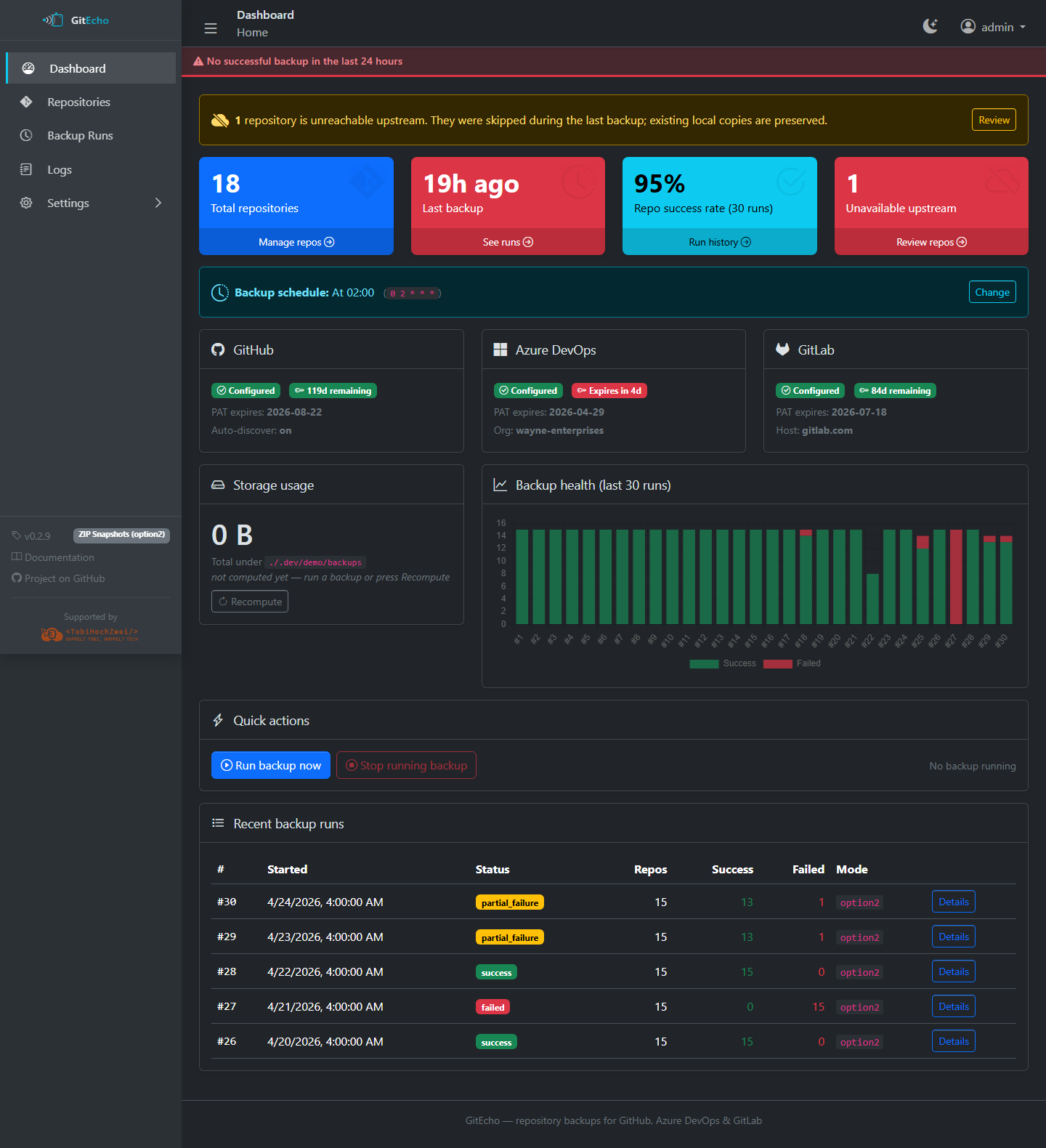 GitEcho records the expiration date you enter alongside each PAT and warns on the dashboard when one is within seven days of expiring.